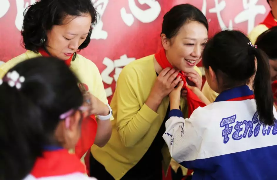 學生們?yōu)槔蠋熡H手系上了紅領巾,表達對老師諄諄教誨的感激之情。