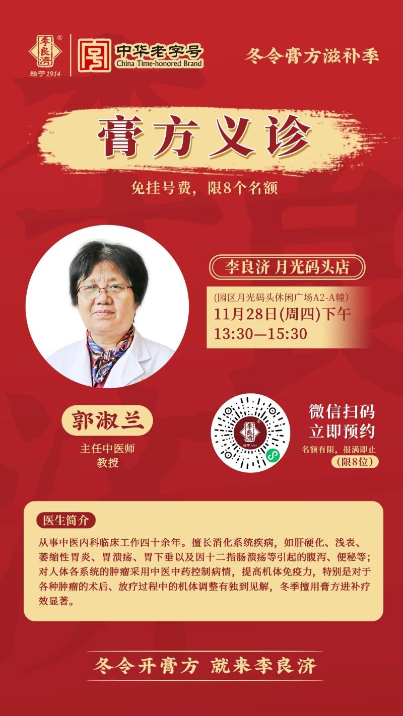 11月28日下午,郭淑蘭主任在李良濟月光碼頭店坐診,免費送出8個義診號,義診免掛號費!